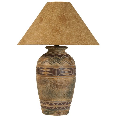 Create a rustic look while illuminating your room by adding this Southwest Hydrocal Urn Table Lamp. It stands 30 inches tall and is crafted of quality hydrocal with a soft earth-toned finish that enhances the intricate Southwestern design. This table lamp features an Empire-shaped paprika hide shade to gently diffuse light. It has a 3-way socket switch and requires one 100-watt max bulb not included.