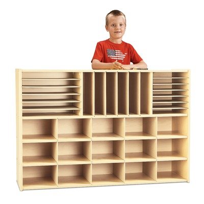 I turned this into my parent center. It fits a light, parent binder, sign in/out sheet, two other papers wide as well as vase of fresh flowers. It's about waist high. I used the bottom as a shoe storage cubby. I added pictures to the boxes I purchased. The top I used as paper cubbies to send the kids work home. I added small Binder Clips with their names on each row. All dividers are made of press board including the dividers for the bottom section. If it had been made entirely of wood it would have scored 5 stars in my book.
