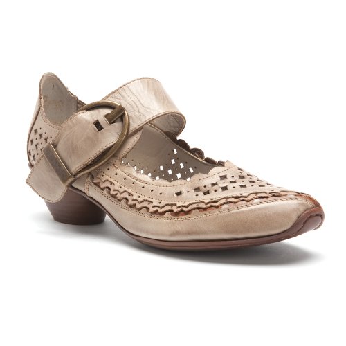 Get stand-out style with the Rieker Mirjam 43787 pump. Handmade in Europe, this women's shoe has a supple full grain leather upper with cutout and overlay accents for a feminine look. Padding in the footbed delivers cushioned comfort; the adjustable strap with an oversized buckle allows a customizable fit. The Rieker Mirjam 43787 pump features a chunky, stacked heel and flexible synthetic sole for lightweight stability.